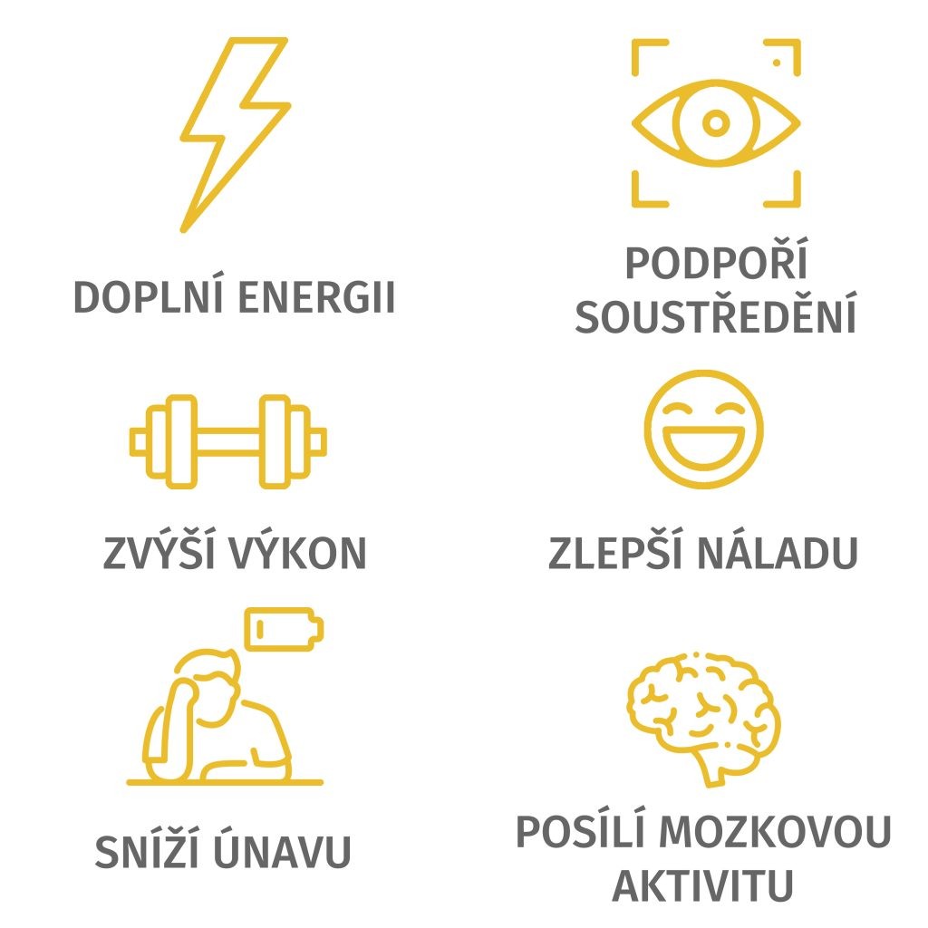 Přírodní kofein pomáhá k lepšímu soustředění, zvýšení výkonu či bystrosti. Vitamin C přispívá ke snížení míry únavy a vyčerpání, normální psychické činnosti, nervové soustavy, ochraně buněk před oxidativním stresem. Tyto složky tak spolu v kombinaci s L-theaninen, Citrulinem nebo Tyrosinem z Tackery dělají funkční doplněk stravy postavený na více aktivních látkách než klasický, plechovkový energy drink.